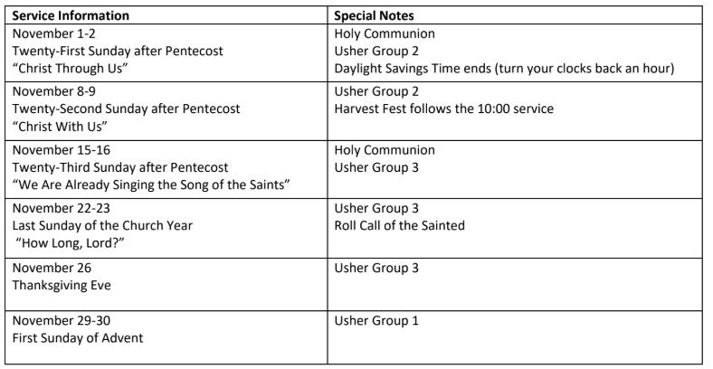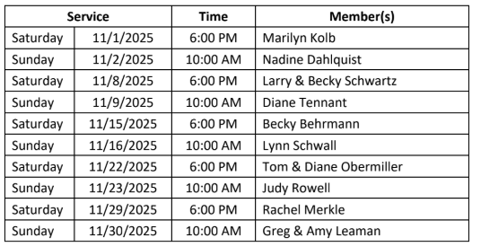 Thanksgiving Service: At the Voters’ Meeting held on Sunday, October 26th , it was decided that we will only have one Thanksgiving Service and it will be held on Wednesday, November 26th, at 6:00 pm. “Enter his gates with thanksgiving, his courtyards with praise. Give thanks to him and bless his name.” (Psalm 100:4)